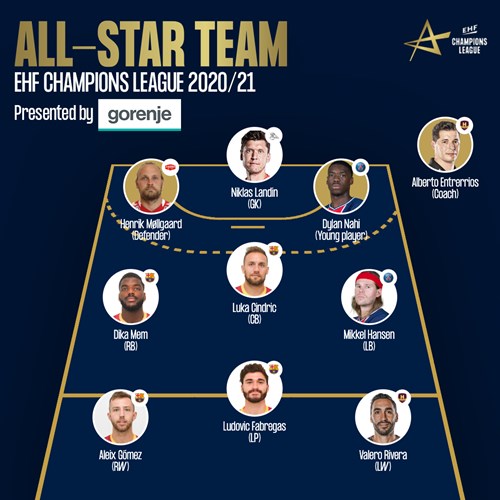 Uz Luku Cindrića, u idealnom sastavu sezone 2020./2021. Lige prvaka još su tri igrača Barce: desno krilo Aleix Gomez, desni vanjski Dika Mem te kružni napadač Ludovic Fabregas. Najbolji vratar je Niklas Landin (THW Kiel). Lijevo krilo je Valero Rivera (Nantes). Na vanjskim pozicijama uz Luku Cindrića, nalazi se još Mikkel Hansen (PSG). Zanimljivo, svi su oni osim Niklasa Landina, sudionici FINAL 4 ovoga vikenda u Njemačkoj.