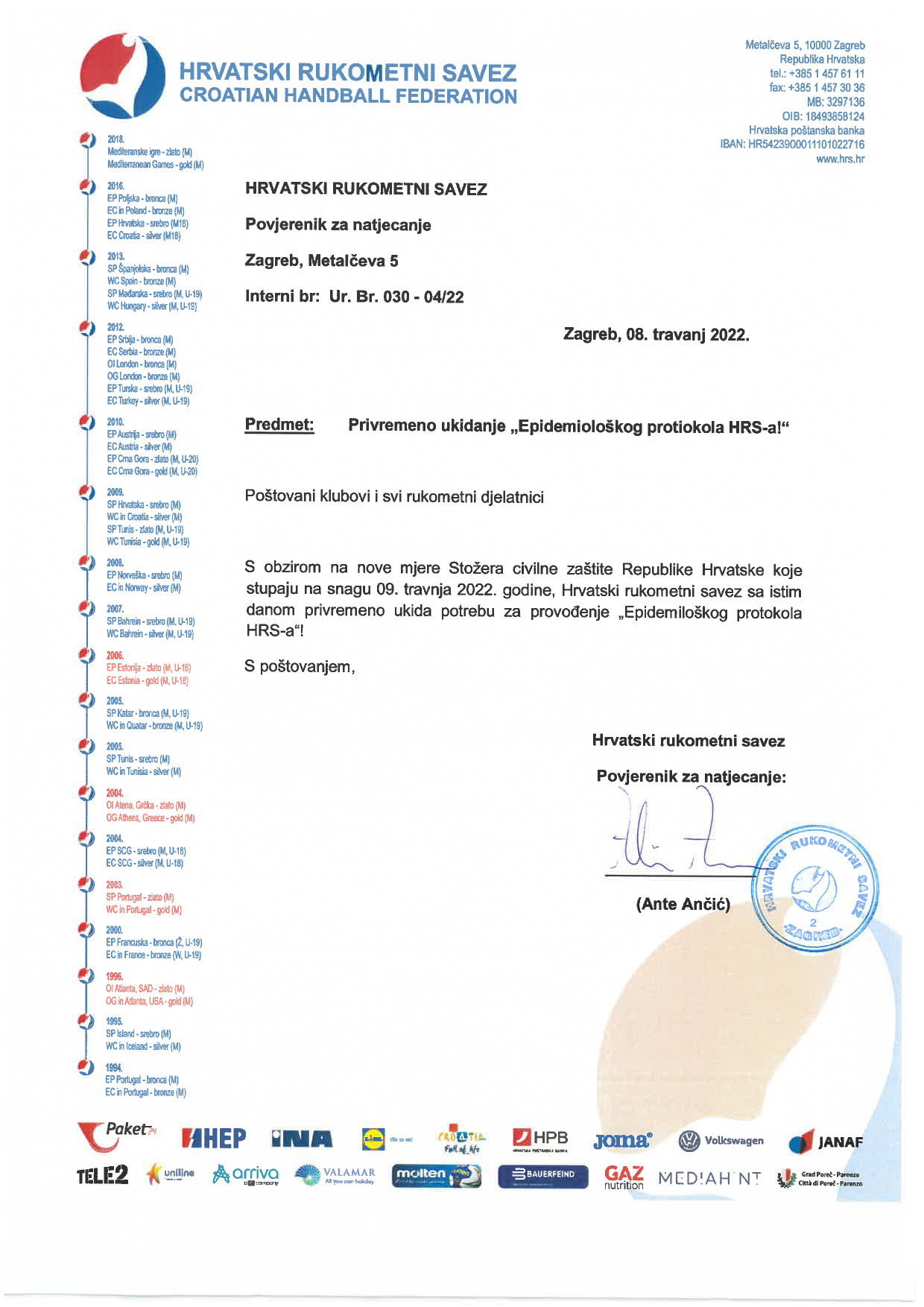 s obzirom na nove mjere Stožera civilne zaštite Republike Hrvatske, u nastavku se nalazi i odluka HRS-a!