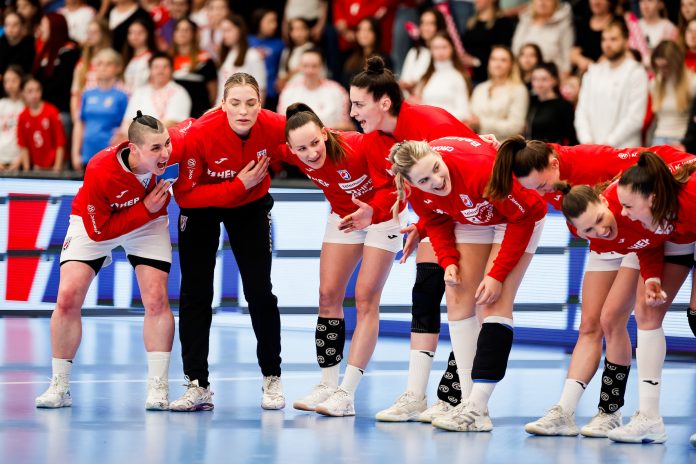 Katarina JEŽIĆ, Lucija BEŠEN, Paula POSAVEC, Klara BIRTIC and Dejana MILOSAVLJEVIĆ, Croatia vs Spain, WCh 2025 - W - Qualification Europe Phase 2, Vienna, Austria, 10.04.2025, Mandatory Credit © Anze Malovrh / kolektiff