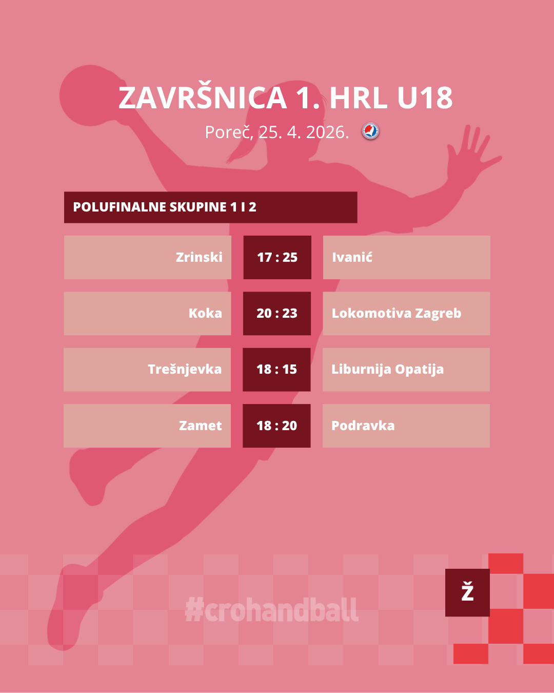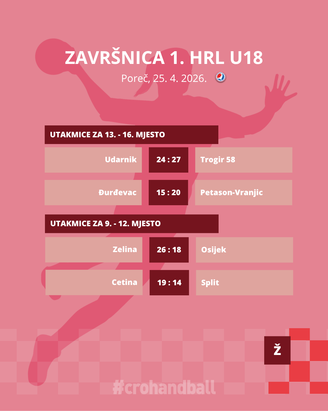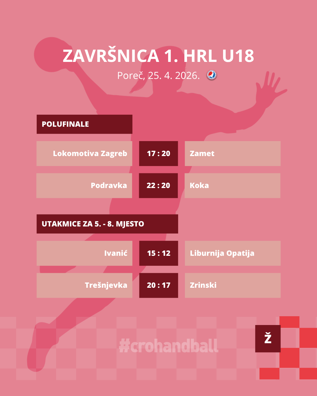 Sutra nas čeka posljednji dan prve ovosezonske Završnice kada ćemo saznati tko će ponijeti titulu najboljih hrvatskih rukometašice do 18 godina. Prva utakmica počinje u 9:00 sati, borba za broncu između Lokomotive i Koke na rasporedu je točno u podne, a veliko finale između Podravke i Zameta počinje u 13:00 sati. Sve utakmice finalnog dana mogu se pratiti uživo putem YouTube kanala HRS-a, a sve dosadašnje fotografije dostupne su na Photodecku HRS-a.