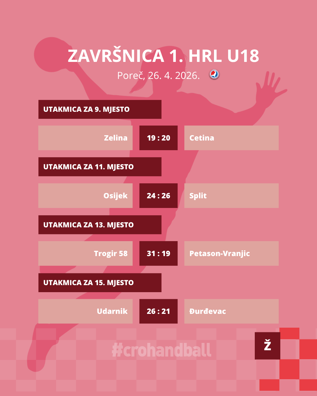 No, krenimo redom. Prije utakmica za medalju, odigrano je i šest utakmica za poredak. Posljednji dan Završnice krenuo s borbom za 15. mjesto u kojoj je Udarnik rezultatom 26:21 pobijedio Đurđevac. U utakmici za 13. mjesto Trogir 58 pobijedio je Petason-Vranjic 31:19, dok je 11. mjesto pripalo Splitu koji je nakon izvođenja sedmeraca pobijedio Osijek 26:24. Iz Poreča s devetim mjestom odlaze rukometašice Cetine koje su s minimalnih 20:19 bile bolje od Zeline. U utakmici za sedmo mjesto Zrinski je pobijedio Liburniju Opatiju 25:22, a Ivanić je bio bolji od Trešnjevke 17:15.