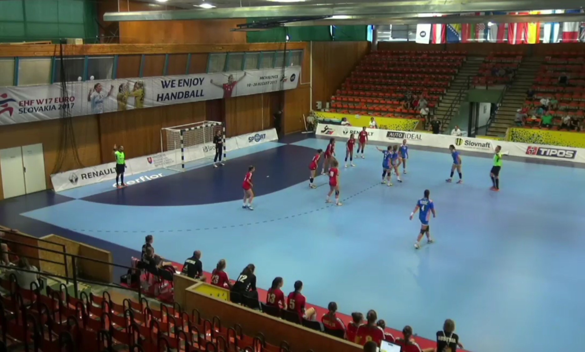 Dobro su Hrvatice otvorile i povele s 3:0 prije svega zahvaljujući dobrom angažmanu u obrani. Međutim, serija grešaka omogućila je Austriji da ulovi priključak i dođe do izjednačenja. Neko vrijeme igralo se gol za gol, a onda je Hrvatska prešla u vodstvo od tri pogotka koje do kraja poluvremena nije ispuštala. Izabranice Gorana Bobića na odmor su otišle s rezultatom 16:13 što im je otvaralo vrata prema revanšu za porazu koji su već pretrpjele od Austrije u ovom natjecanju.