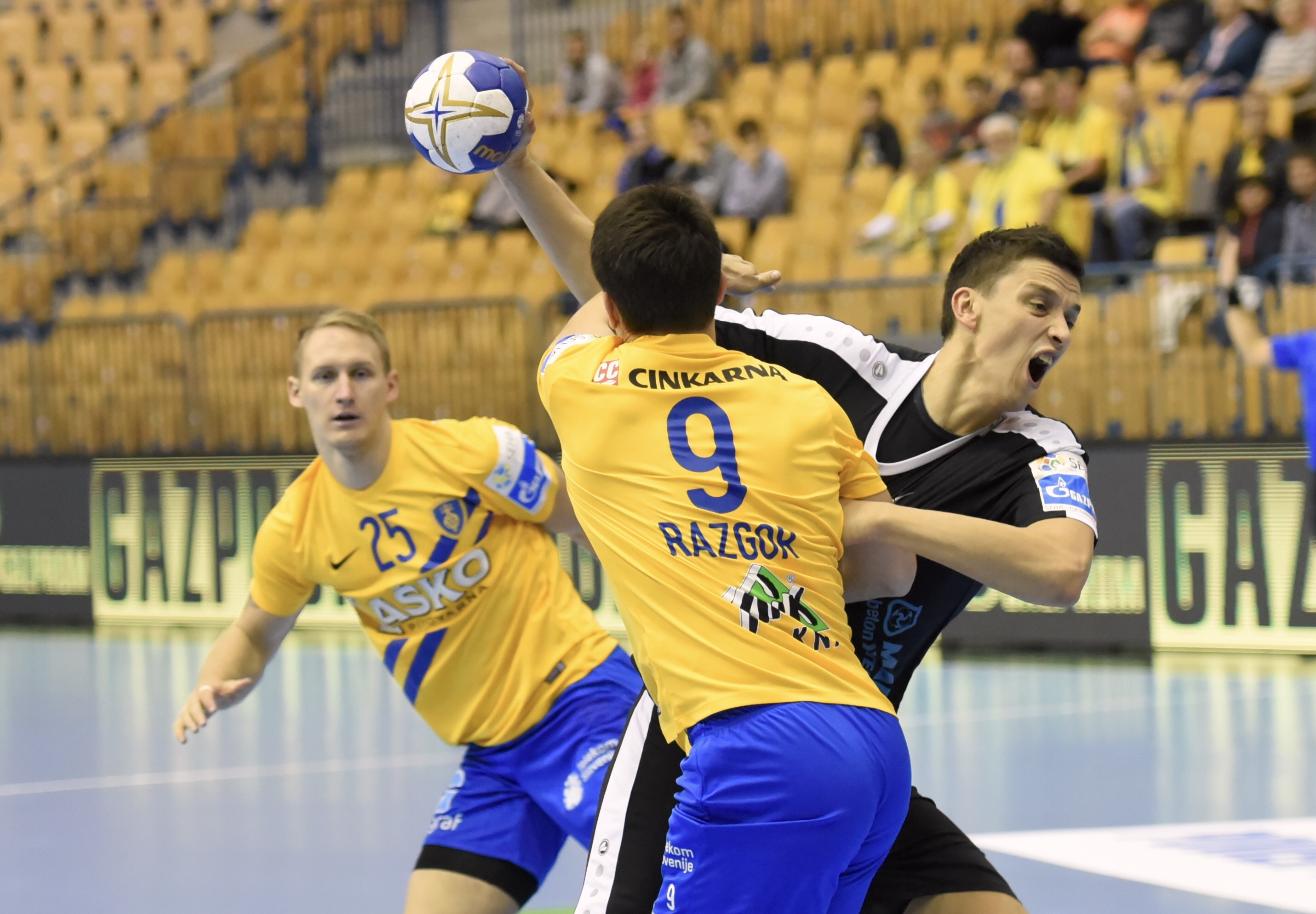 Domaćini su dobro krenuli pa preko Davida Razgora i Gala Marguča poveli 3:1. Prvi Nexe do približavanja dovodi Marin Šipić (2:3), ali dalje ga igrači nisu pratili. Raspoložen napad Celja ponovno je ubrzao tempo i pobjegao na 6:3. Nexe je ostatak prvog poluvremena lovio Celje. Prvo je Marko Buvinić načeo put sa 10:8, a onda su serijom 3-0 uz Sašu Barišić-Jamana i Marija Tomića pred kraj prvog poluvremena poravnali rezultat na 11:11. Do isteka 30 minute pala su tek ukupno dva gola pa se pri izjednačenom rezultatu otišlo i na odmor (12:12).