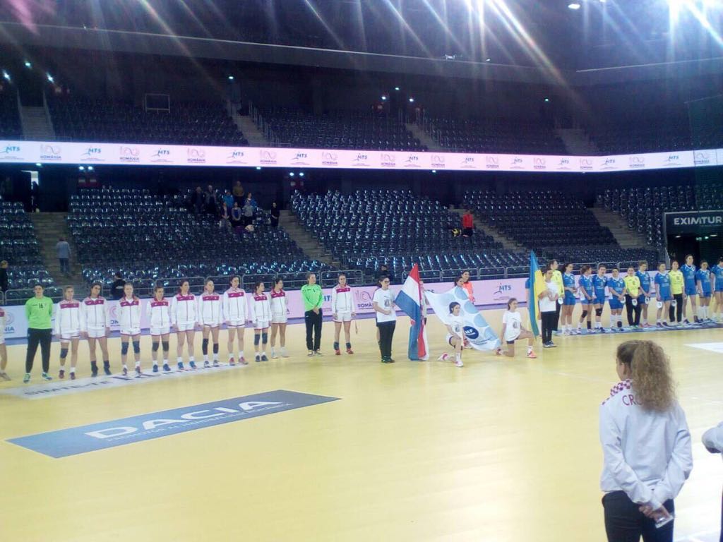 Hrvatska juniorke dobro su otvorile utakmicu i povele s +2, no nakon 4:2 uslijedila je nova crna rupa tijekom koje je Ukrajina prvo u desetoj minuti izjednačila (4:4), a potom i povela 6:4. Zatražio je izbornik Jerković minutu odmora nakon koje je Hrvatska stigla na pogodak zaostatka (6:7). Stvorila je Hrvatska serijom 2-0 za vodstvo, ali Ukrajina nanovo poravnava. Iako su protivnice naših juniorke uvijek bile za vratom, Hrvatska je držala minimalno vodstvo. Preokret se dogodio u posljednjoj minuti prvog poluvremena kada je Ukrajina iskoristila grešku Hrvatske i na odmor uspjela otići s 14:13.