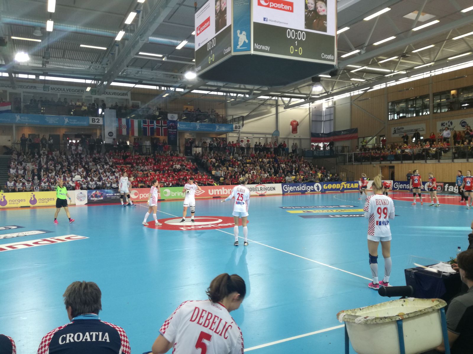 U 12. minuti Veronica Kristiansen imala je šansu iz sedmerca poravnati, ali sjajno je obranila Ivana Kapitanović kojoj je to bila treća obrana. No, dvije minute kasnije Sanna Solberg donosi prvo izjednačenje u susretu. Izbornik Šoštarić pozvao je time-out, ali nakon njega Hrvatska je dobila dva isključenja. Prvo Aneta Benko, a zatim 20ak sekundi kasnije i Marijeta Vidak. Iako su se Hrvatice obranile nakon još jedne sjajne obrane Kapitanović lopta se odbija Norvežankama u ruke i u 17. dolaze do prvog vodstva. Ubrzo nakon povele su i s +2 (9:7), ali više od toga im Hrvatska nije dopustila. Šoštarićeve izabranice imale su u 22. minuti šansu za izjednačenje, ali je obranila Grimsbo i Norveška je ponovo na +2. Na samom kraju prvog dijela Benko je sjajno zabila svoj drugi pogodak pa je Hrvatska na odmor otišla sa samo pogotkom zaostatka.