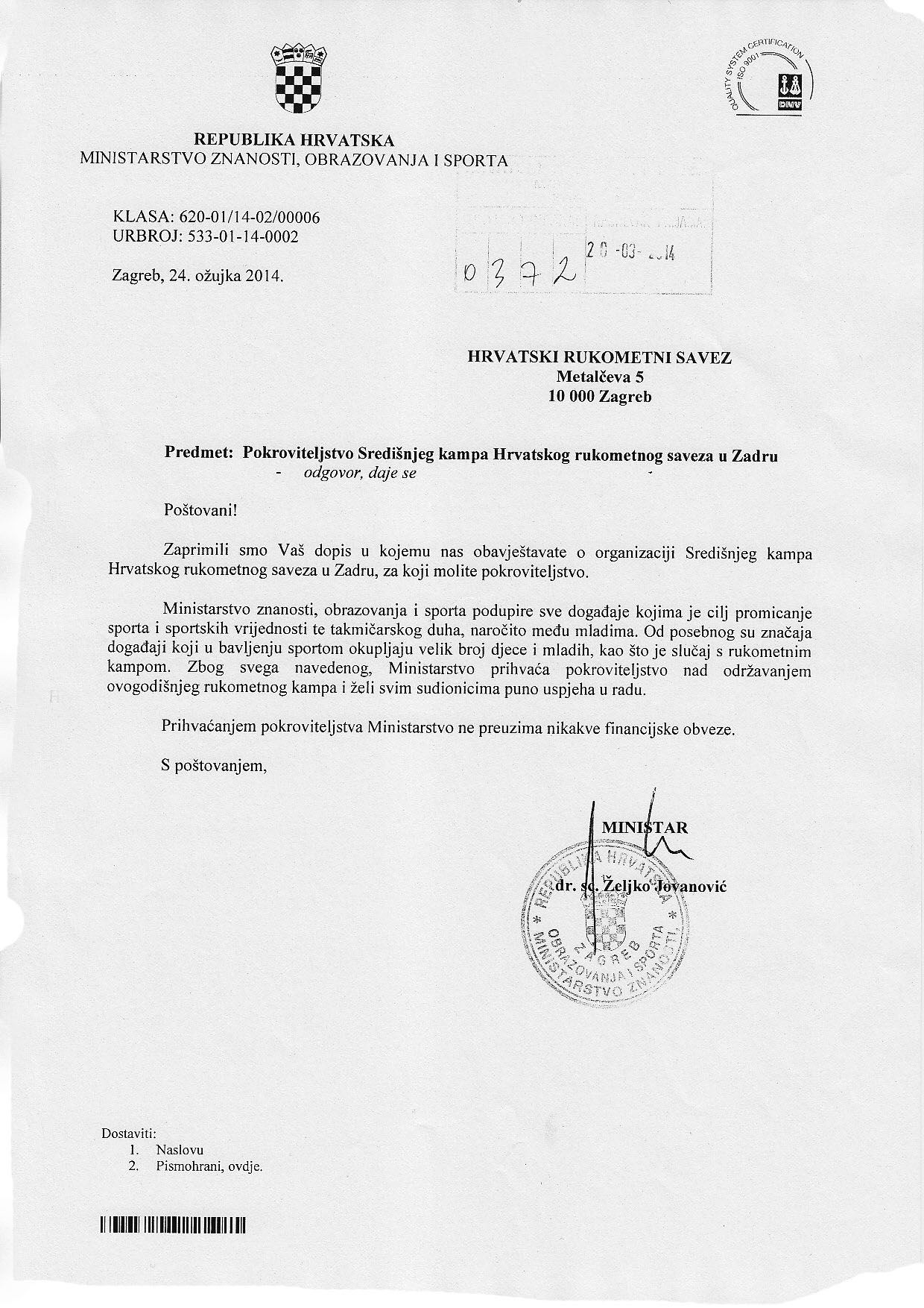 Ministarstvo Znanosti obrazovanja i sporta  podupire sve događaje kojima je cilj promicanje sporta i sportskih vrijednosti te takmičarskog duha, naročito među mladima. Od posebnog su značaja događaji koji u bavljenju sportom okupljaju velik broj djece i mladih kao što je slučaj s rukometnim kampom. Zbog svega navedenog, Ministar prihvaća pokroviteljstvo nad održavanjem ovogodišnjeg kampa i želi svim sudionicima puno uspjeha u radu.